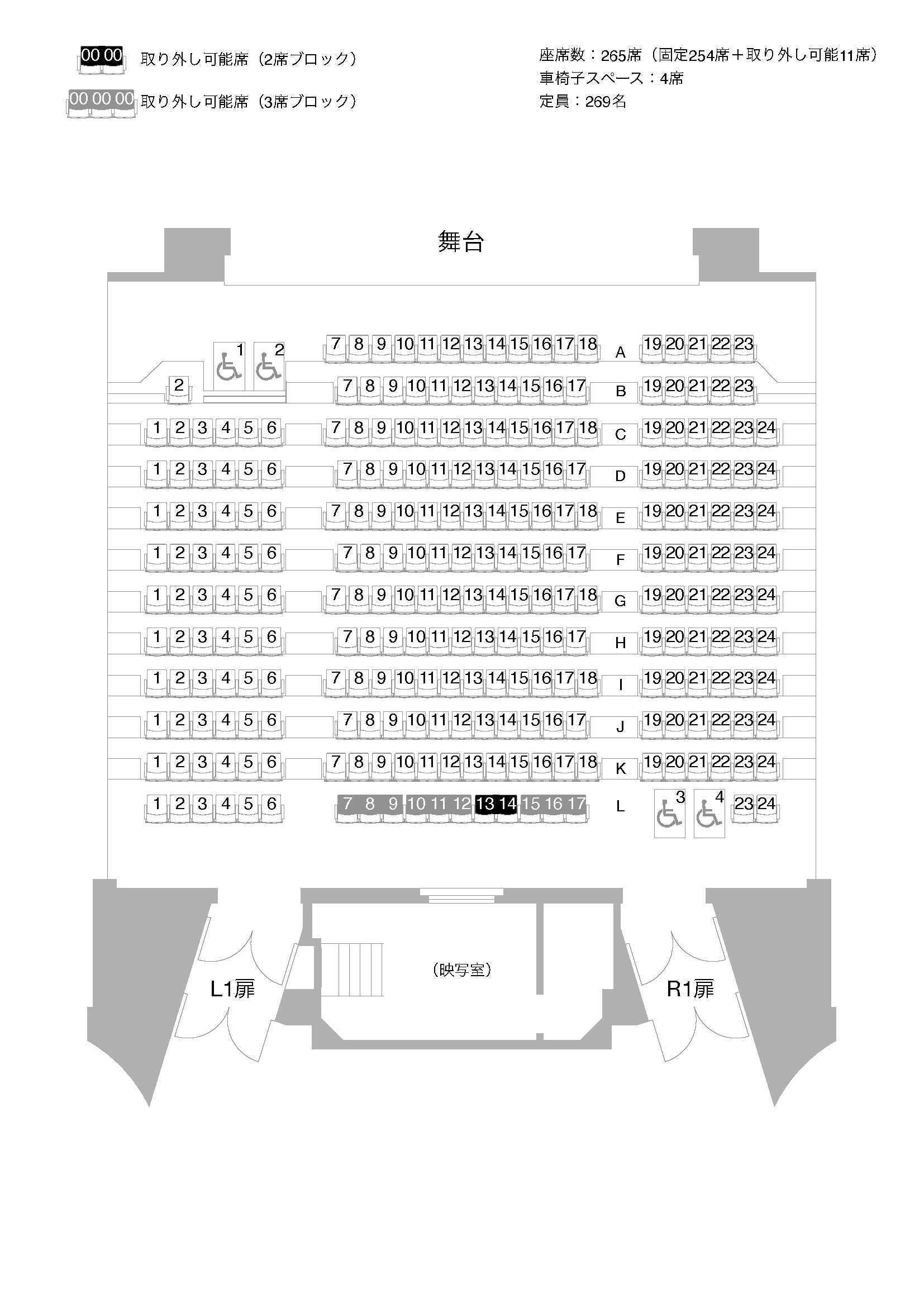 小ホール車いすスペースは4席を確保。舞台下手側の最前列に車いすスペースを増設しました。