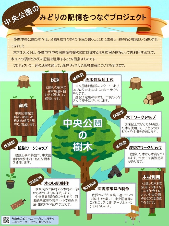 「中央公園のみどりの記憶をつなぐプロジェクト」は多摩市立中央図書館の整備に際し、伐採するそれらの木々を市民の財産として有効に再利用することで、木々への感謝と「みどりの記憶」を継承することを目指したものです。