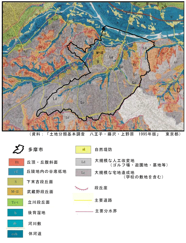 多摩市の地形は丘陵地、段丘面、低地、人工改変地、宅地造成地に分けられます。