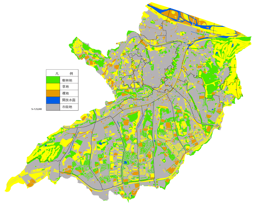 緑被地とは、樹林地、草地(農耕地を含む)、裸地(学校のグランド等、緑で覆われていなくても自然的環境の状態にある土地)及び開放水面を含む水辺地を総称した名称です。また、これらの場所が地域面積に占める割合を緑被地率といいます。