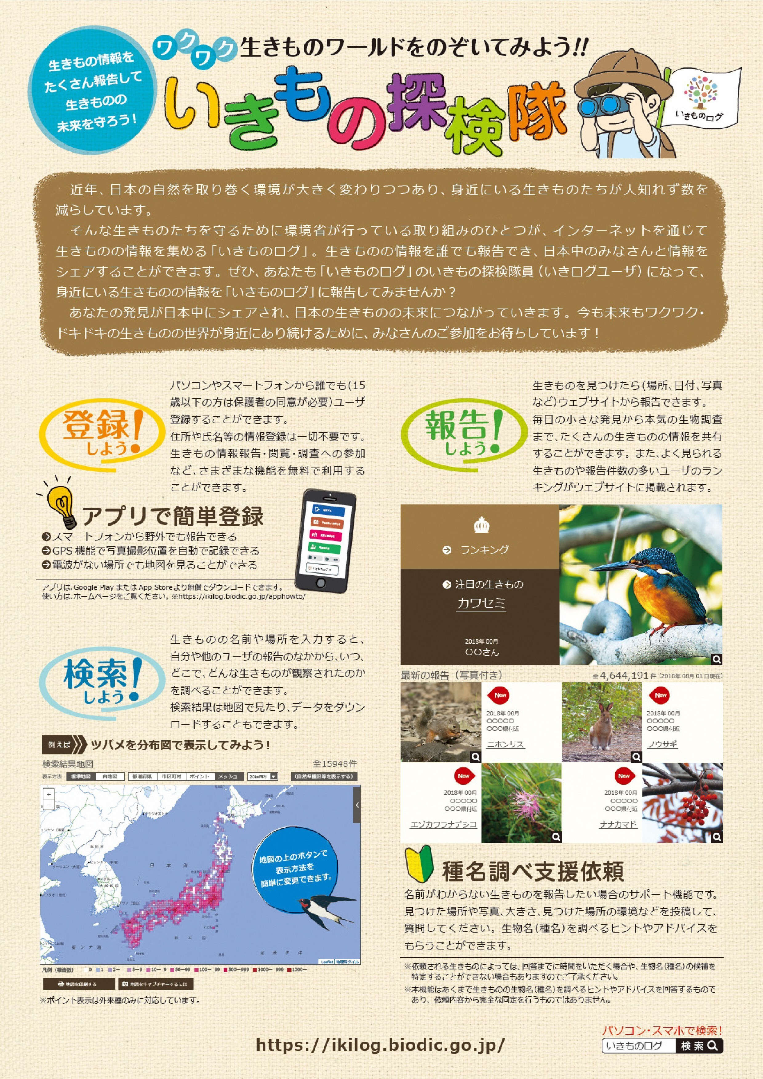 環境省が運営する「いきものログ」は、インターネットを通じて、だれでも生きものの情報をシェアできるシステムです。身近な生きものの情報を投稿できるほか、調査や観察の記録を管理するツールとして使用でき、他のユーザーと記録を共有していくことで、全国の生きものの状況を知ることもできます。