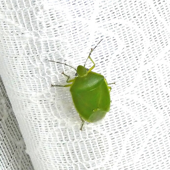 | 178 | 10月10日 | 関戸4丁目 | ツヤアオカメムシ | 屋内のカーテンに止まっていました。 南方系のカメムシで、北の方へ分布を広げています。 | ○ |