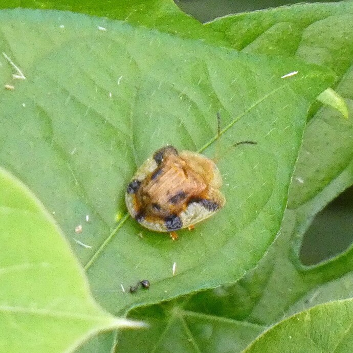 | 204 | 9月21日 | 大栗川 霞が関橋上流 | ヨツモンカメノコハムシ | 体長1cm位 クズの葉の上にいた。 南方系の虫で、サツマイモの葉を食害する。 6、7年前、厚木市、町田市で見つかり、その後都内でも見つかっていて北の方へ分布を拡大中です。 | ○ |