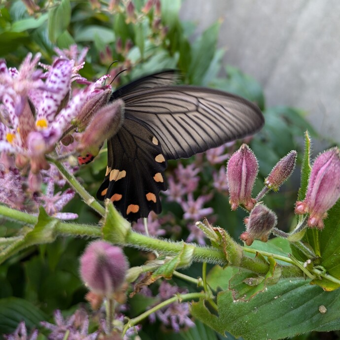 | 207 | 10月27日 | 中沢2丁目 | ジャコウアゲハ雌 | 毎年ジャコウアゲハが飛来しますがこの時期に雌が飛来したのは初めてです。ただいつものようにウマノスズクサにひたすらたまごをうみつけるわけではなく、ホトトギスに止まったりあちこち飛び回っていました。 | ○ |