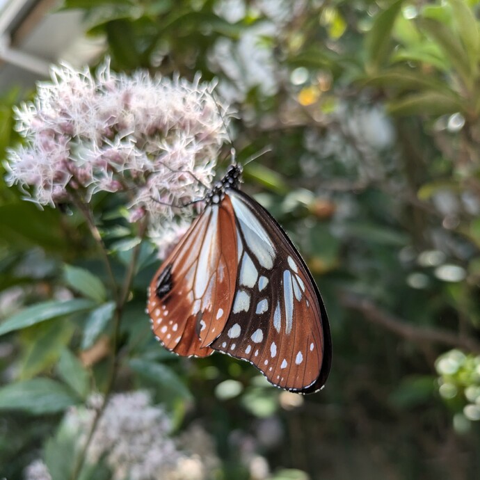 | 205 | 10月22日 | 中沢2丁目 | アサギマダラ | フジバカマを植えて3年目。いつも寒くなる頃に満開になるので諦めていましたがついに来てくれました。夕方なのに時間をかけて蜜を吸っていました。 | ○ |