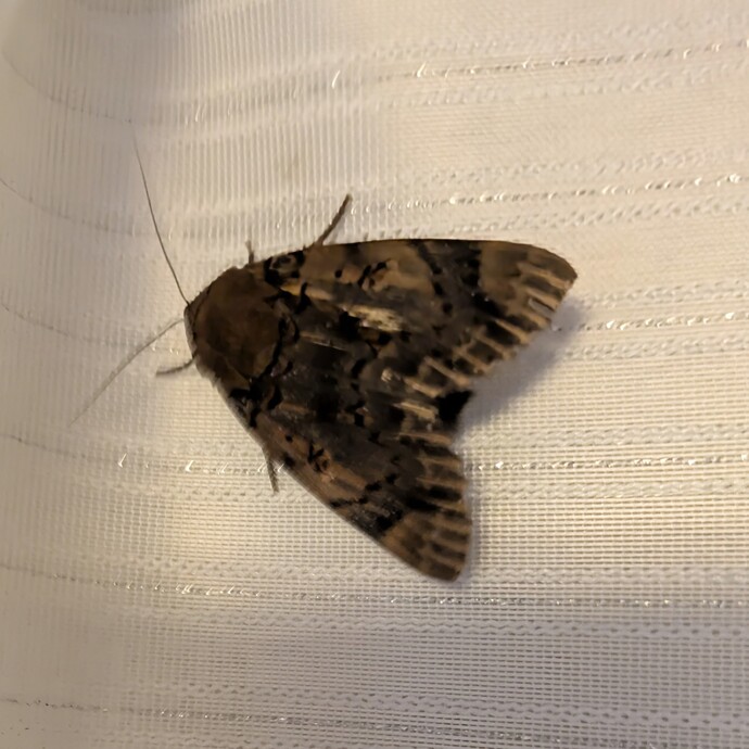 | 213 | 11月28日 | 中沢2丁目 | フクラスズメ | 夜雨戸を開けたら黒い蝶のようなものが飛び込んで来、さんざん飛び回ったあとカーテンに止まりました。成虫のまま冬越ししていたフクラスズメでした。 | ○ |