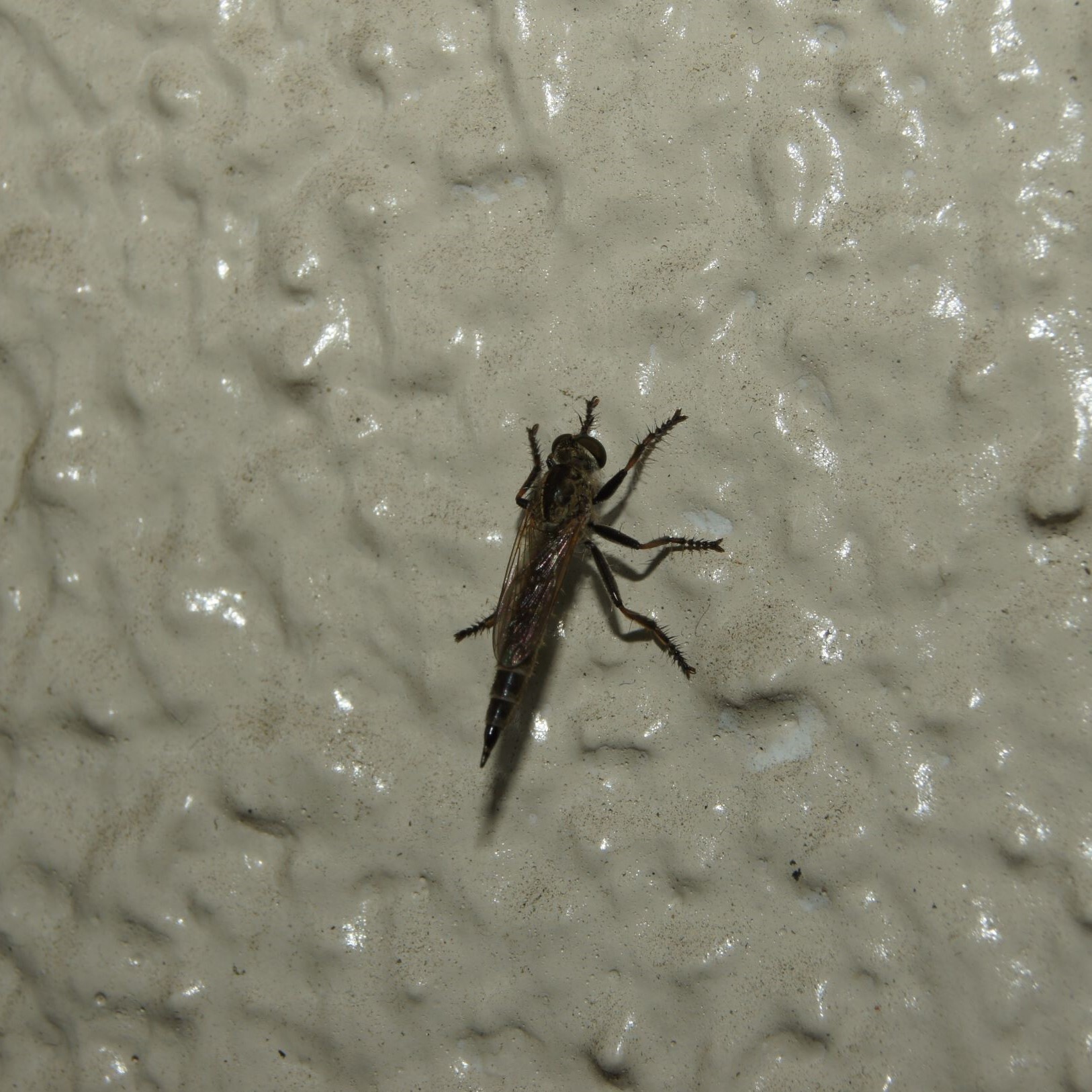 ムシヒキアブの仲間だとは思うのですが、同定に自信ありません。どちらにせよ、尾が尖っているのでメス?初めて見るアブでした。 | ○ |